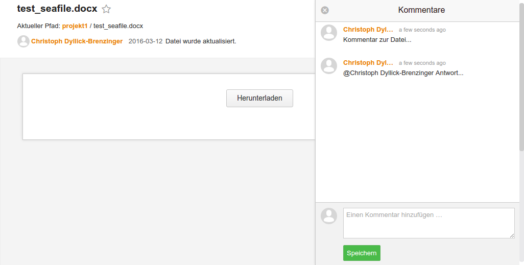 Über die Weboberfläche von Seafile kann nun in der Detailansicht für jede Datei eine Kommentarleiste eingeblendet werden. In dieser können die Benutzer ihre Kommentar zu einer Datei ablegen.